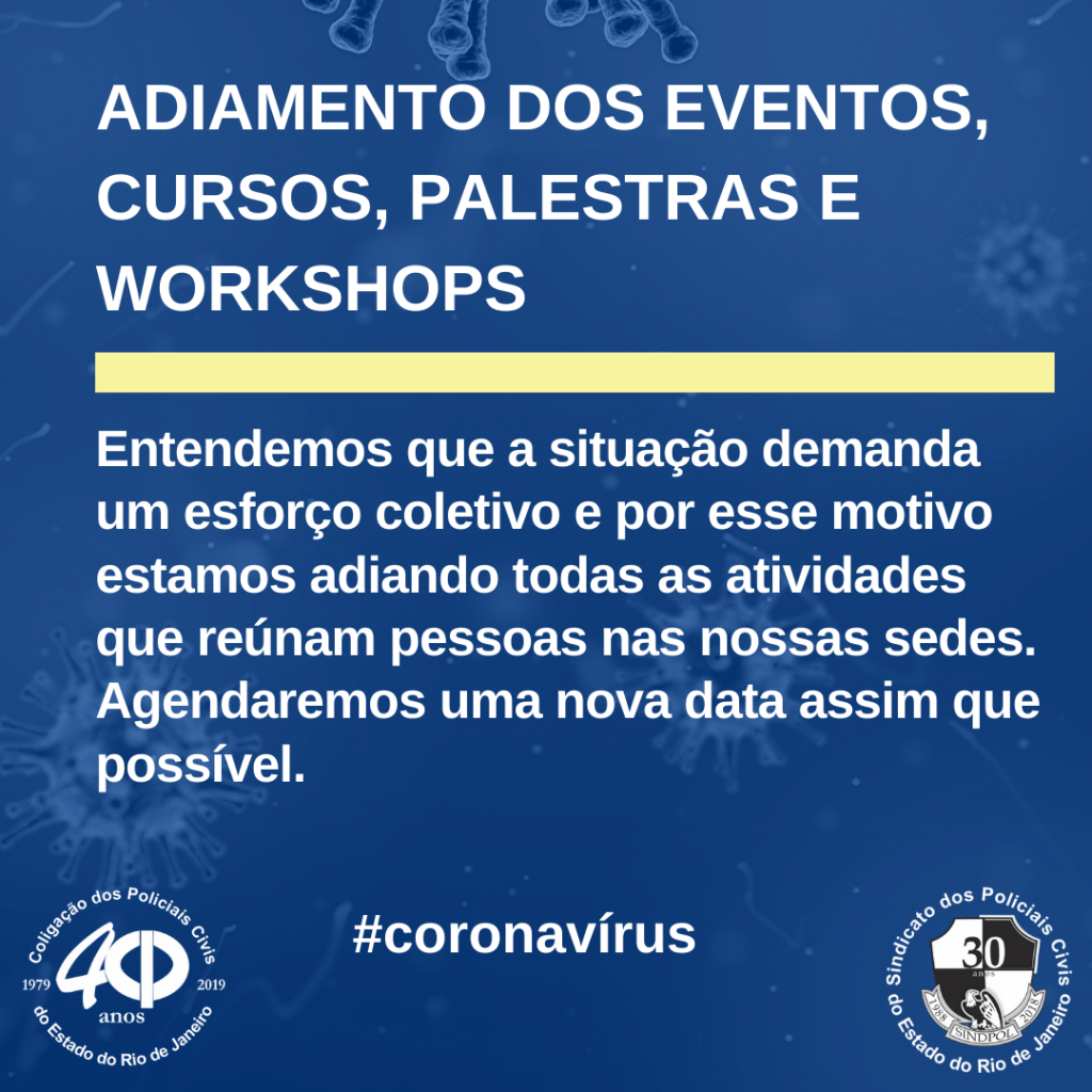 Diante da pandemia do coronavírus, a COLPOL/RJ e o SINDPOL/RJ suspendem todos os workshops, cursos, palestras e encontros do mês de março, até que seja oficialmente decretado pelos órgãos de saúde que tais encontros são seguros para todos os envolvidos.