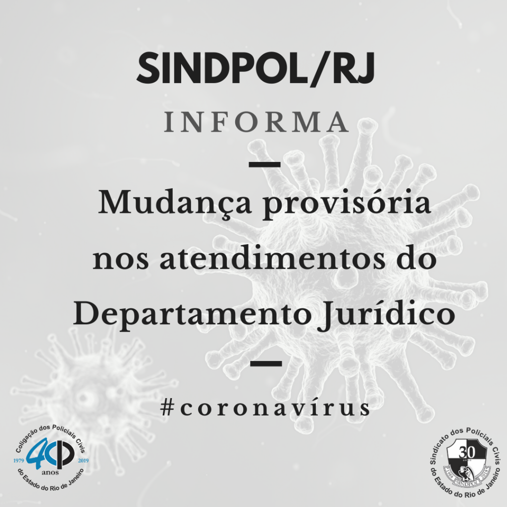 Diante da pandemia do coronavírus, a COLPOL/RJ e o SINDPOL/RJ suspendem todos os workshops, cursos, palestras e encontros do mês de março, até que seja oficialmente decretado pelos órgãos de saúde que tais encontros são seguros para todos os envolvidos.