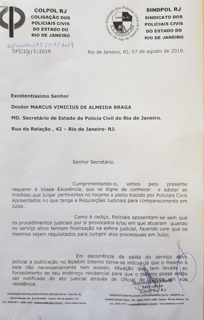 Nesta 4ª feira, 07/08, o SINDPOL-RJ e a COLPOL-RJ enviaram um ofício ao Secretário de Estado de Polícia Civil, Delegado Marcus Vinícius Braga, pedindo que seja avaliada a forma como os policiais aposentados têm acesso às Requisições Judiciais para comparecimento em juízo. É que ao aposentar, em geral o policial aposentado perde acesso ao BI. […]