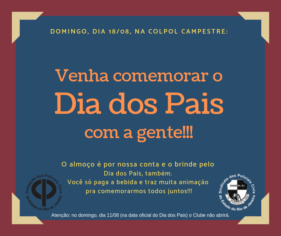 O almoço é por nossa conta e o brinde pelo Dia dos Pais, também. Você só paga a bebida e traz muita animação pra comemorarmos todos juntos!!! Atenção: no domingo, dia 11/08 (na data oficial do Dia dos Pais) o Clube não abrirá.