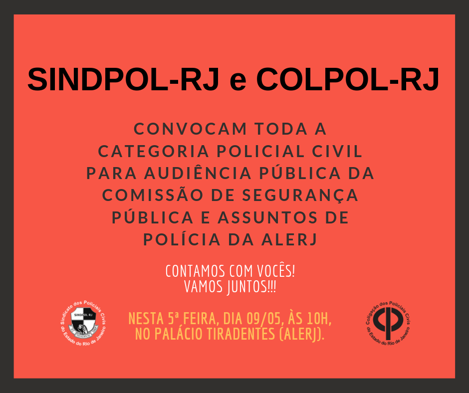 Convocação da categoria para Audiência Pública da Comissão de Segurança Pública e Assuntos de Polícia da ALERJ, nesta 5ª feira, 09/05, às 10h, na ALERJ