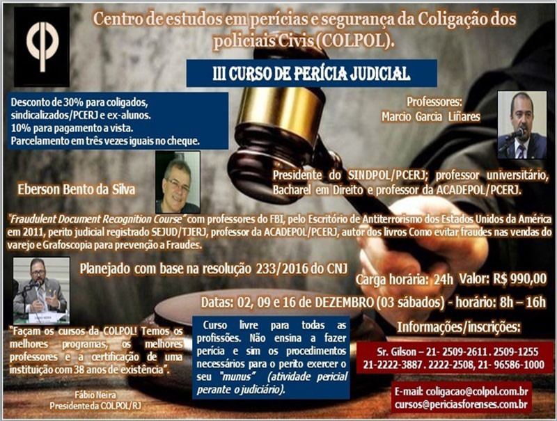 Acontecerá nos três primeiros sábados de dezembro o “III curso de Perícia Judicial da COLPOL”. Trata-se de curso obrigatório para quem deseja atuar como perito judicial perante o TJRJ. Solicite a ficha de Inscrição. A Coligação de Policiais Civis do Estado do Rio de janeiro está de portas abertas pra todas os profissionais que desejam […]