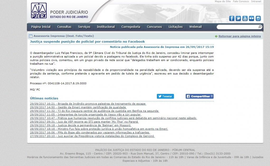 Mais uma vitória do Departamento Jurídico da Parceria SINDPOL / COLPOL: Justiça suspende punição de policial civil por manifestação no Facebook.
