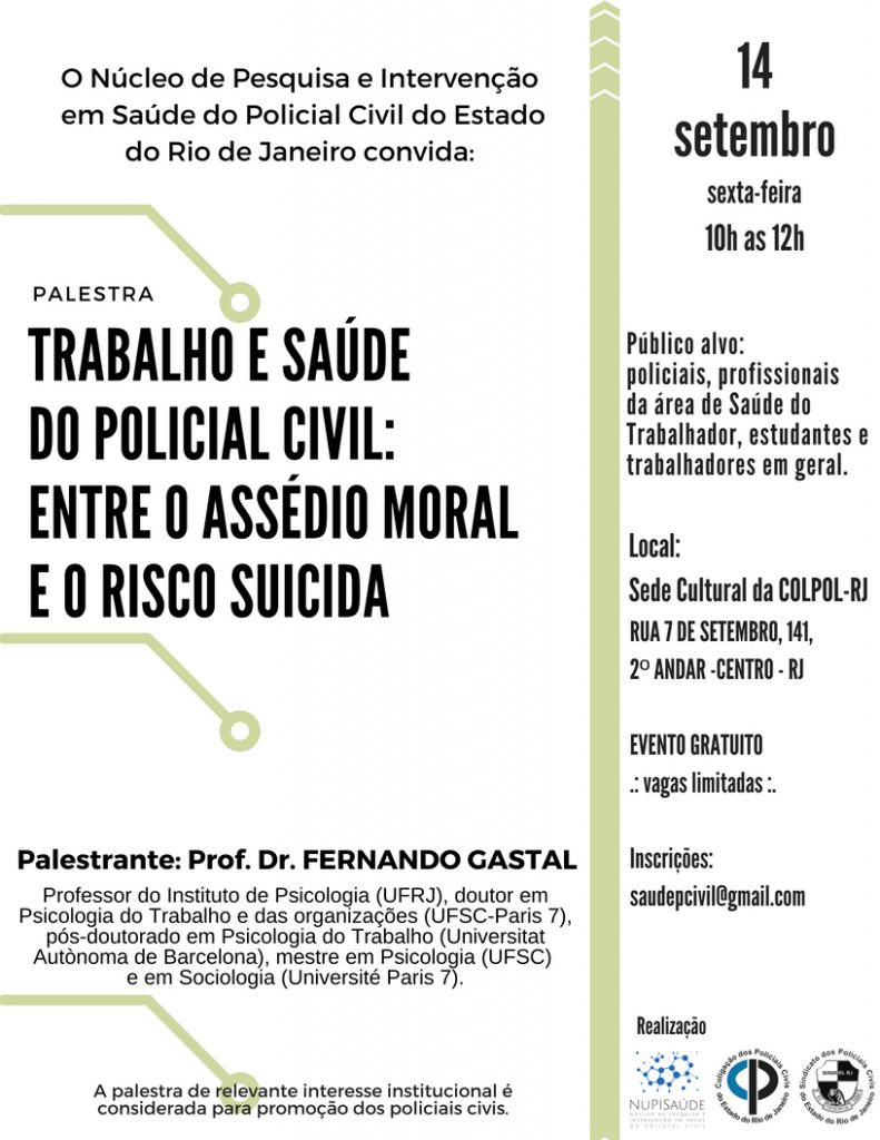 O Núcleo de Pesquisa e Intervenção em Saúde do Policial Civil do Estado do Rio de Janeiro (NuPISaúde) da COLPOL-RJ e SINDPOL-RJ convida para palestra “Trabalho e Saúde do Policial Civil: entre o assédio moral e o risco suicida”, que será ministrada pelo Profº Doutor Fernando Gastal, da UFRJ. Gastal é mestre em Psicologia (UFSC) […]