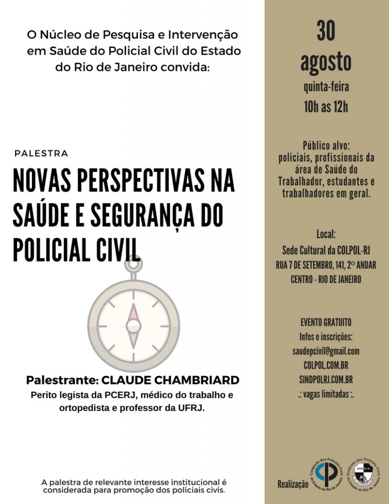 A Coligação dos Policiais Civis do Estado do Rio de Janeiro (COLPOL-RJ) e o Sindicato dos Policiais Civis do Estado do Rio de Janeiro (SINDPOL-RJ) – através do Núcleo de Pesquisa e Intervenção em Saúde do Policial Civil do Estado do Rio de Janeiro (NuPISaúde) -, realizarão no dia 30 de agosto a palestra “Novas […]