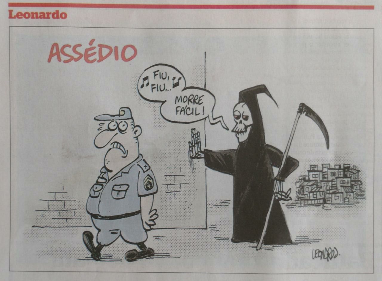 É lamentável a falta de sensibilidade e o desrespeito do profissional e do editor que autorizou essa piada, que atinge a todos os policiais do Brasil, em especial aos do Rio de Janeiro, caçados e mortos às centenas nos últimos anos. Não se brinca com assédio e morte!