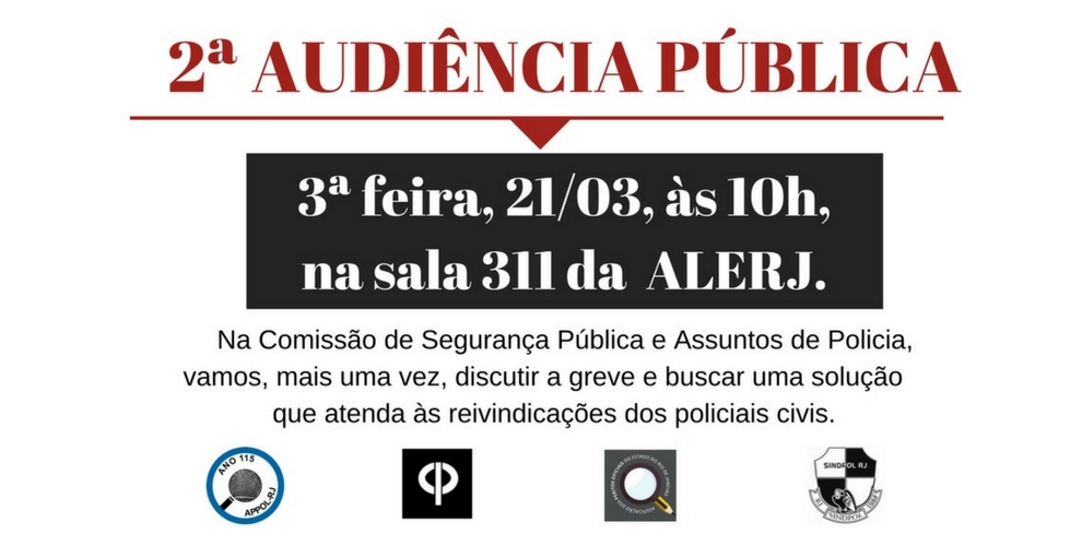 A Comissão de Segurança Pública e Assuntos de Policia da ALERJ, presidida pela deputada Martha Rocha, convida para nova audiência pública que tem como objetivo discutir a greve e buscar uma solução que atenda às reivindicações dos policiais civis, tais como pagamento do décimo terceiro salário e das horas extras (o chamado RAS). A audiência é aberta aos policiais e será realizada na terça-feira, dia 21/03, às 10 horas, sala 311, na ALERJ. Como o local tem capacidade para pouco mais de 50 pessoas, os interessados em assistir a audiência pública devem chegar com certa antecedência para garantir lugar. Compareça!