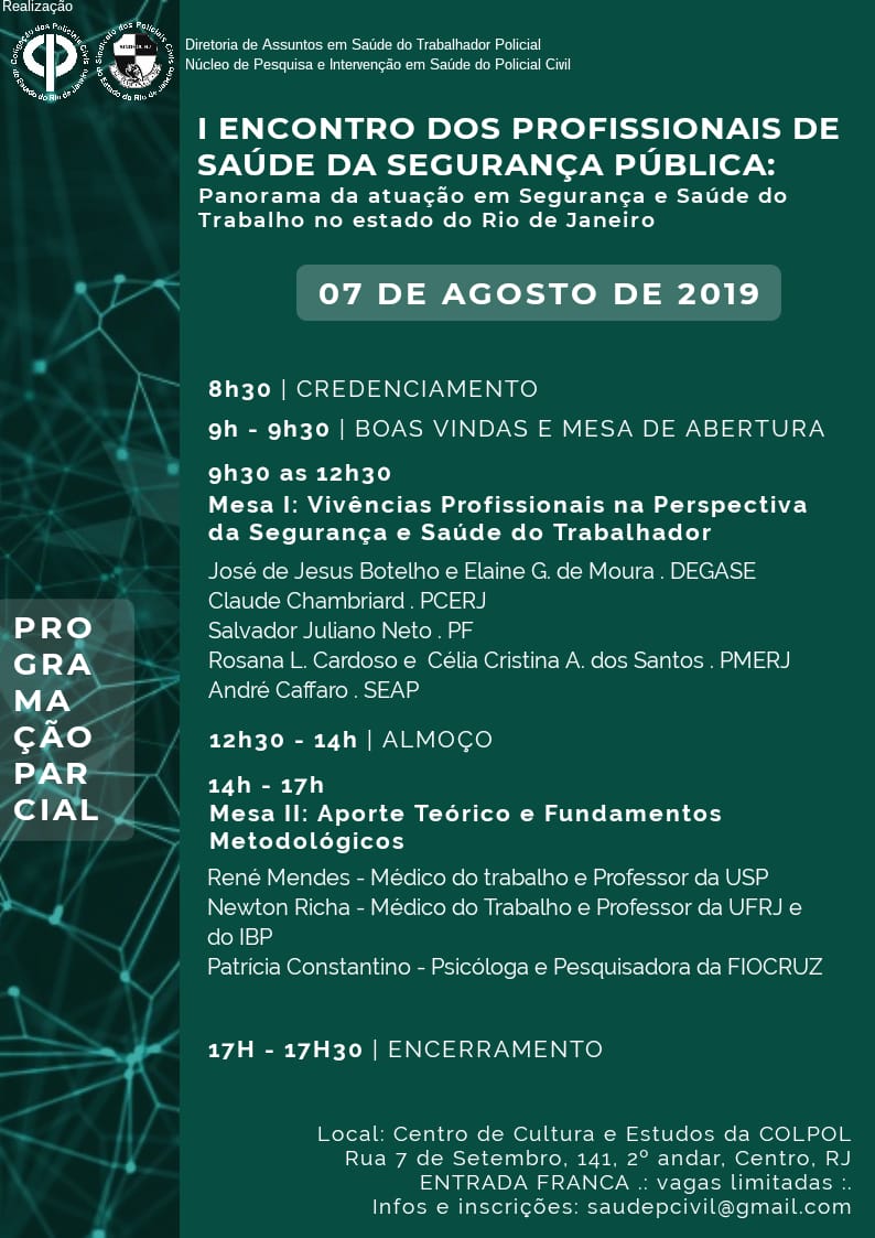 O Núcleo de Pesquisa e Intervenção em Saúde do Policial Civil (NuPISaúde) e a Diretoria de Assuntos em Saúde do Trabalhador Policial da Coligação e do Sindicato dos Policiais Civis do Estado do Rio de Janeiro divulgaram hoje (23/07) a programação do “I Encontro de Profissionais de Saúde da Segurança Pública: panorama da atuação em Saúde e Segurança do Trabalho no estado do Rio de Janeiro”.