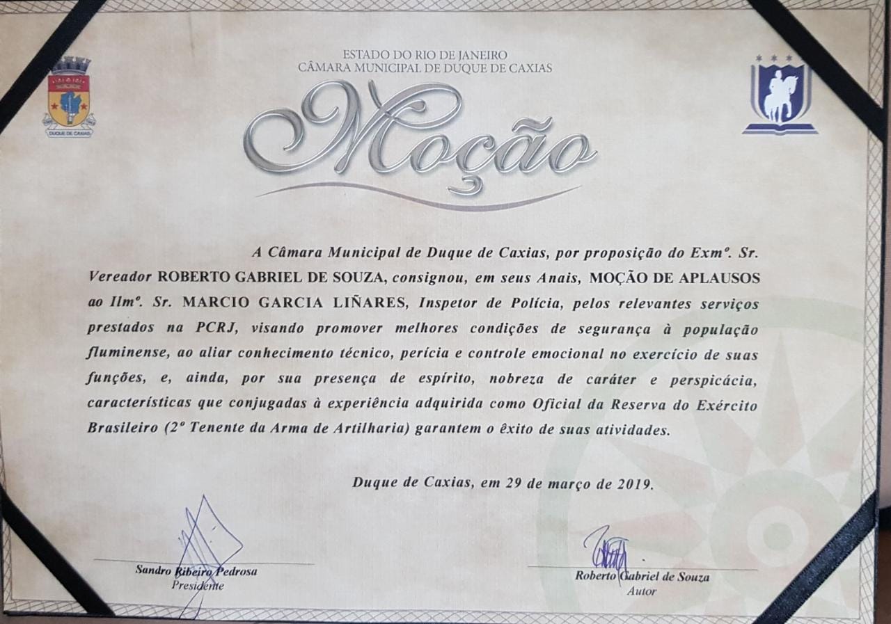 Nos termos da moção de aplausos “pelos relevantes serviços prestados na PCRJ, visando promover melhores condições de segurança à população fluminense, ao aliar conhecimento técnico, perícia e controle emocional no exercício de suas funções, e, ainda, por sua presença de espírito, nobreza de caráter e perspicácia, características que conjugadas à experiência adquirida como Oficial da Reserva do Exército Brasileiro (2° Tenente da Arma de Artilharia) garantem o êxito de suas atividades.”