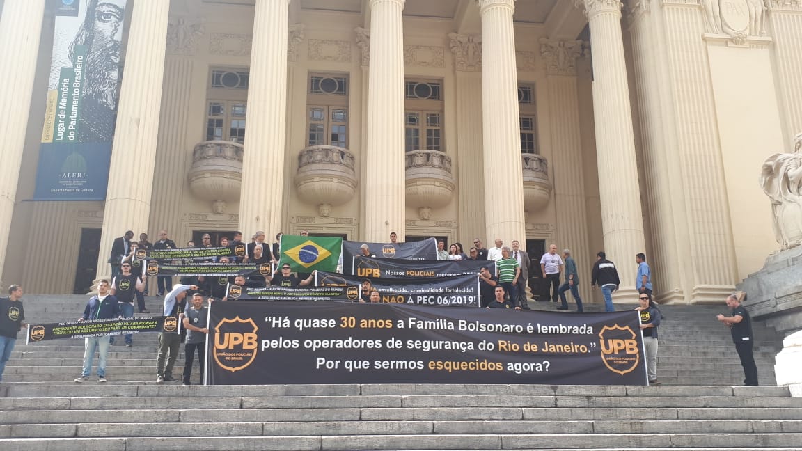 Com o objetivo de chamar a atenção da opinião pública e da própria imprensa, os servidores da Segurança Pública, incluindo os policiais civis, rodoviários federais, os federais, agentes socioeducativos e penitenciários organizaram um ato ao meio-dia nas escadarias da Alerj. Com faixas e cartazes, deixaram claro a sua insatisfação com a Reforma da Previdência proposta pelo governo Bolsonaro, que não reconhece as especificidades da categoria policial e que trata os militares de forma diferenciada em relação a eles. Em uma das faixas, lia-se a frase que resume bem o que a Reforma, assim como está descrito na PEC 06, representa aos policiais: “PEC 06/2019: a pior aposentadoria policial do mundo.”