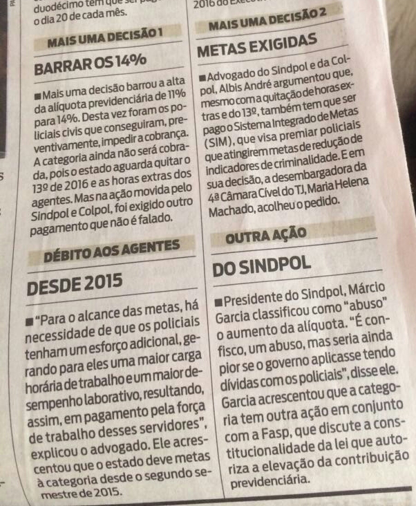 A decisão da Desembargadora Maria Helena Machado, da 4a Câmara Cível, determina que o aumento da alíquota previdenciária de 11 para 14% (aprovada em lei pela ALERJ), não possa ser aplicada, antes que todas as dívidas do Governo do Estado com os Policiais Civis sejam quitadas, incluindo os salários, 13° salário, RAS e gratificação do sistema integrado de metas. A notícia foi publicada no jornal O DIA, edição deste sábado, 21/10/2017.