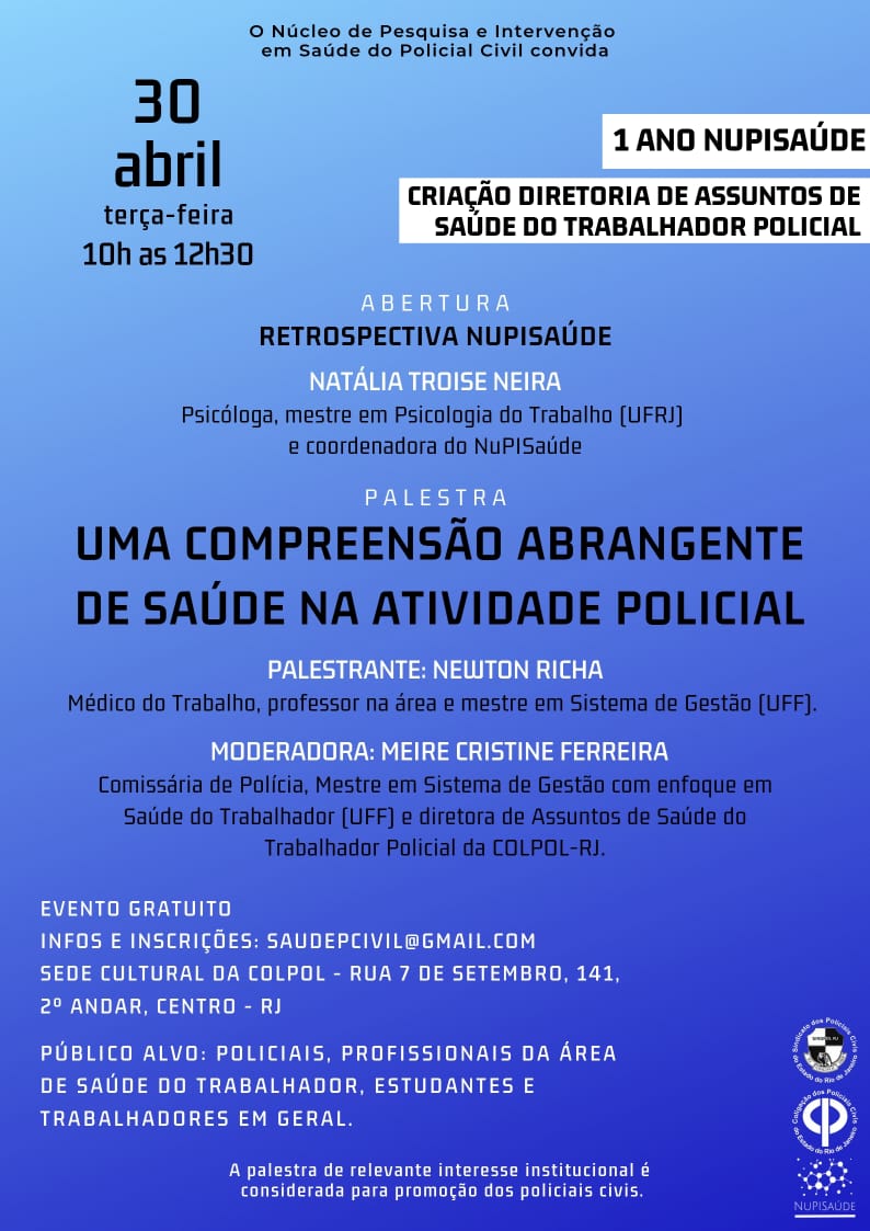 O evento celebra o primeiro ano de criação do NuPISaúde. Por isso, é motivo em dobro de alegria para nós da COLPOL-RJ e do SINDPOL-RJ podermos contar com a presença de vocês na palestra.